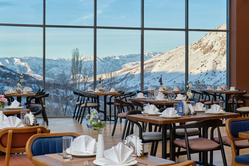 Просторный и светлый зал с современным интерьером создаёт идеальные условия как для спокойных завтраков, так и для уютных обедов и изысканных ужинов. Панорамные окна открывают захватывающий вид на горы Чимгана, делая каждый приём пищи особенно приятным и запоминающимся.